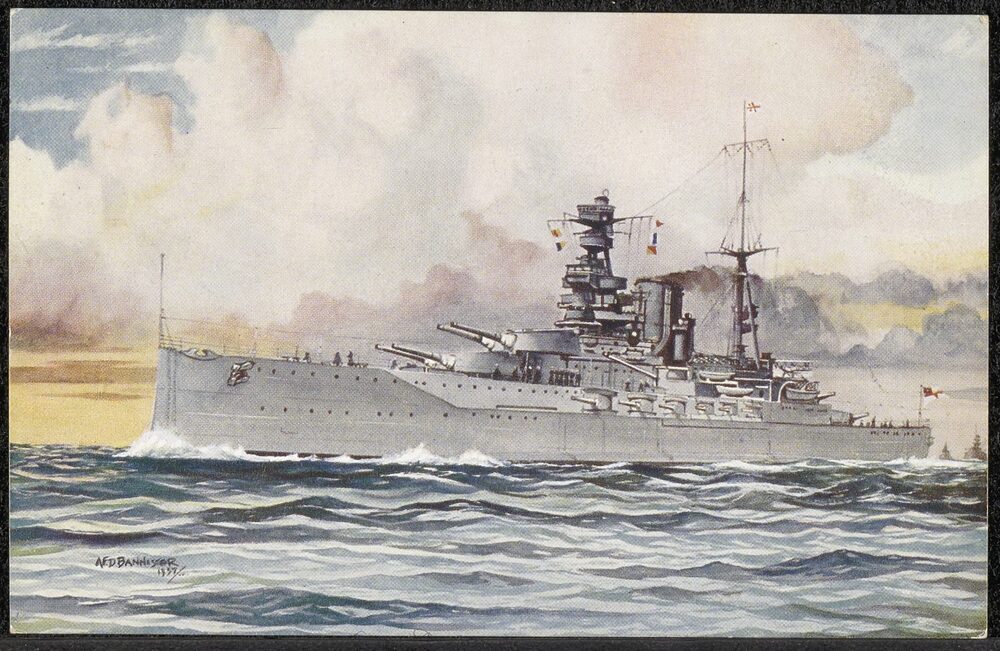Briefkaart met tekening van H.M.S. Barham