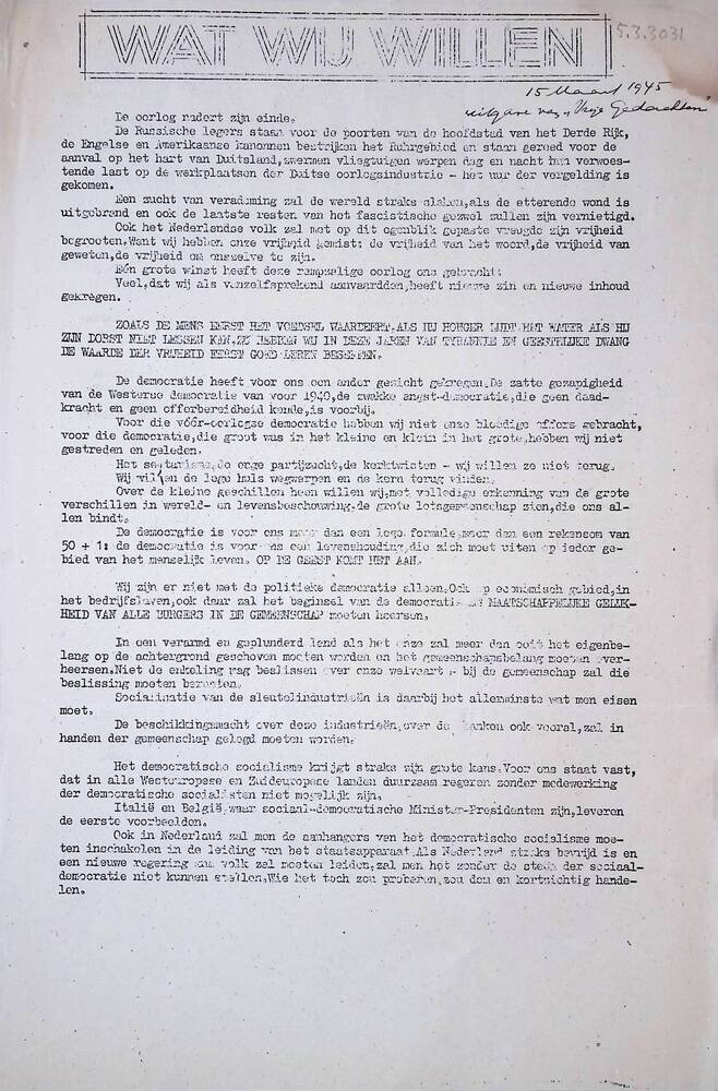 Vrije Gedachten, Wat wij willen, 15 Maart 1945 ( Uit...