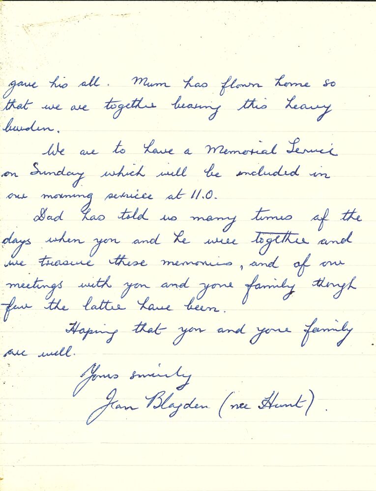 Brief van Jean Blayden (Hunt) aan Ms. Speller waarin...