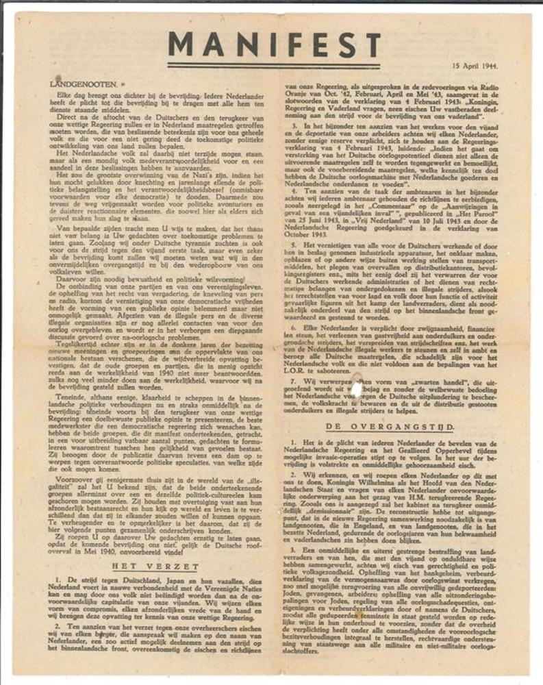 Manifest, dd 15 April 1944 van Het Parool en Vrij Ne...