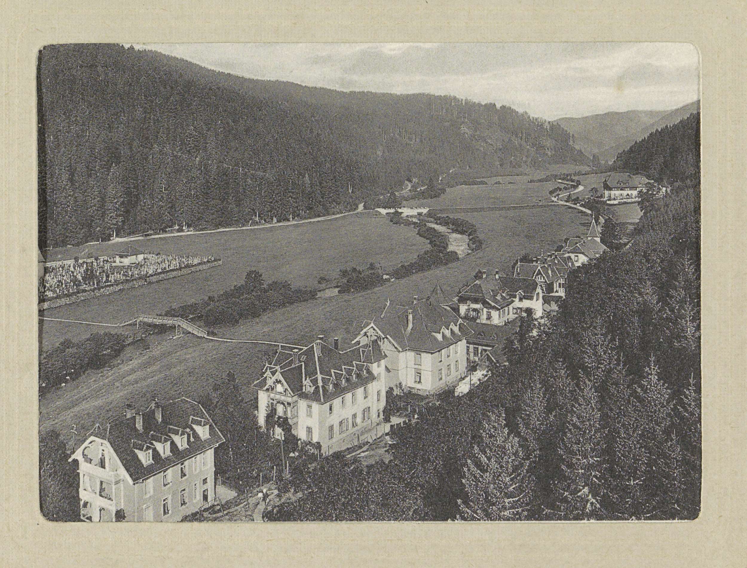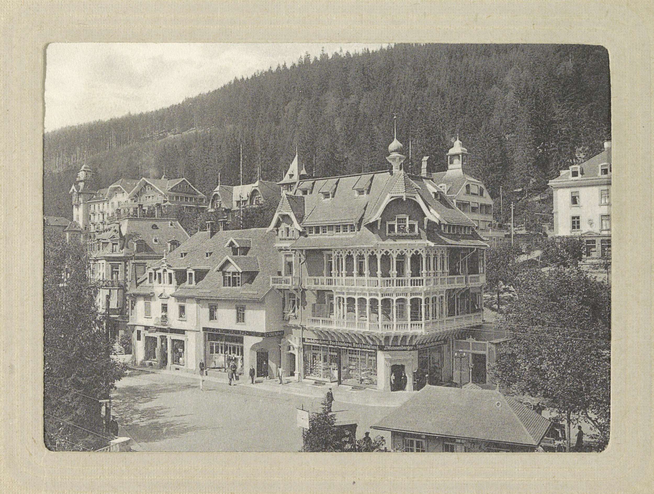 Gezicht op een huizenrij in St. Blasien met rechts h...