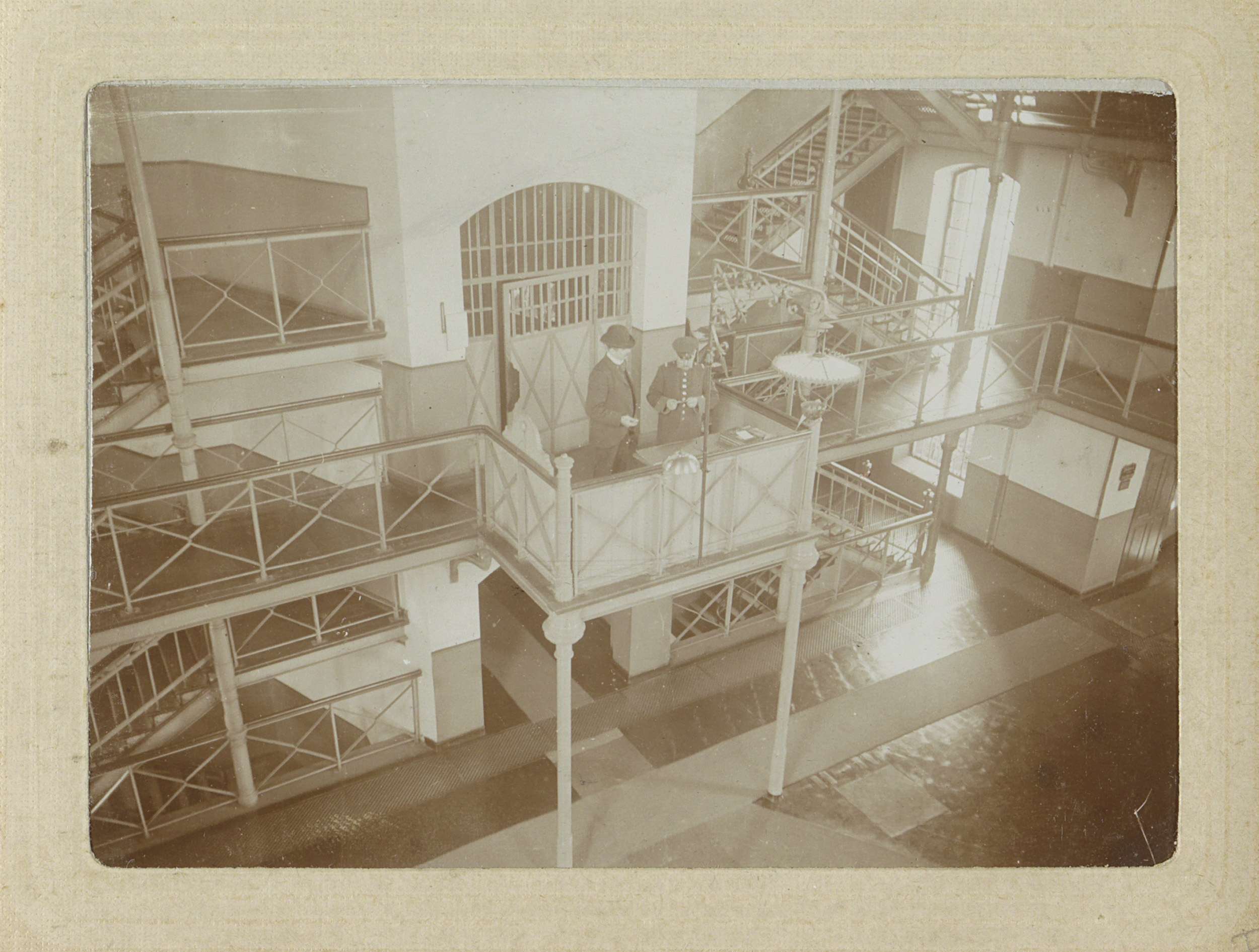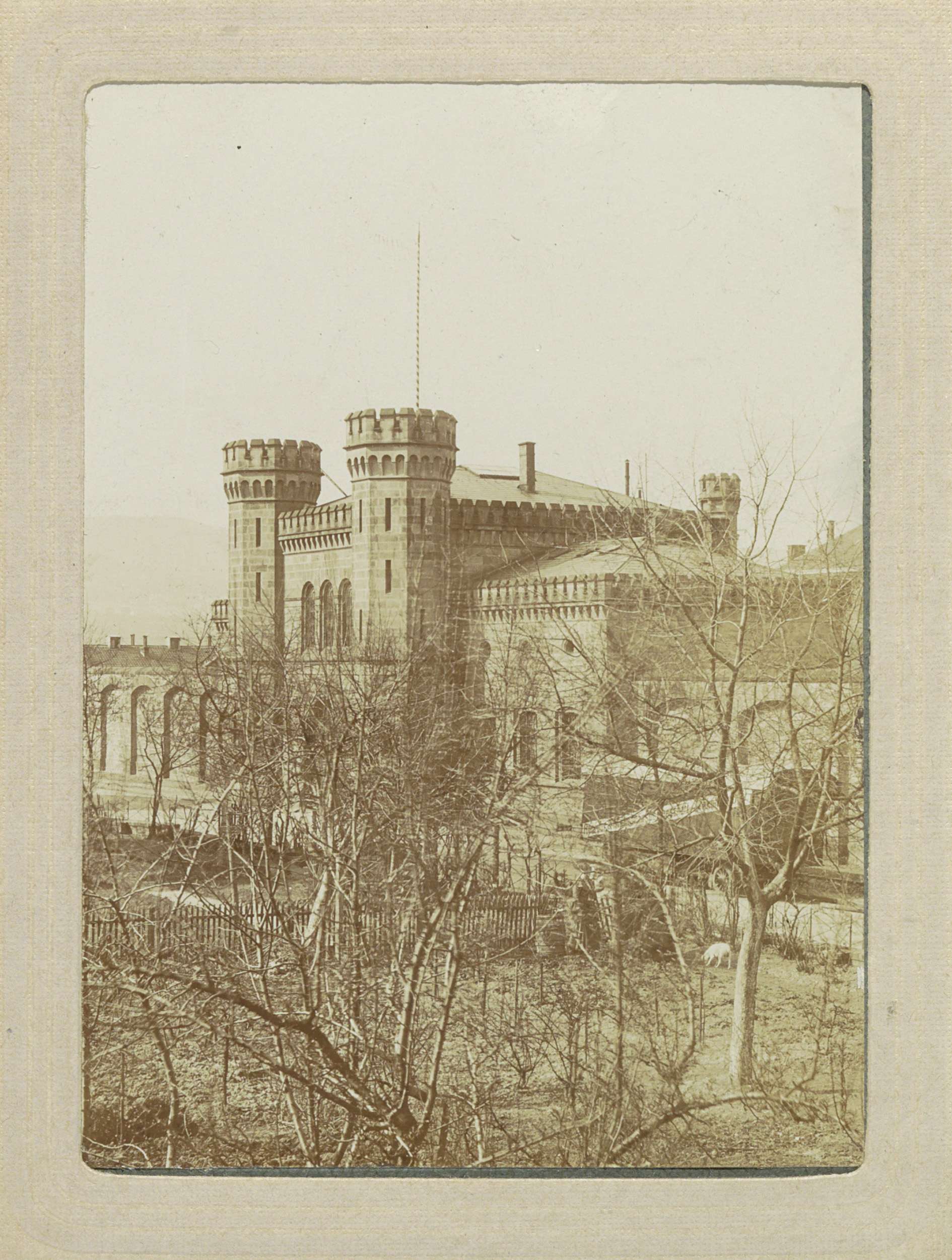 Gezicht op een ommuurd gevangeniscomplex met kerk in...