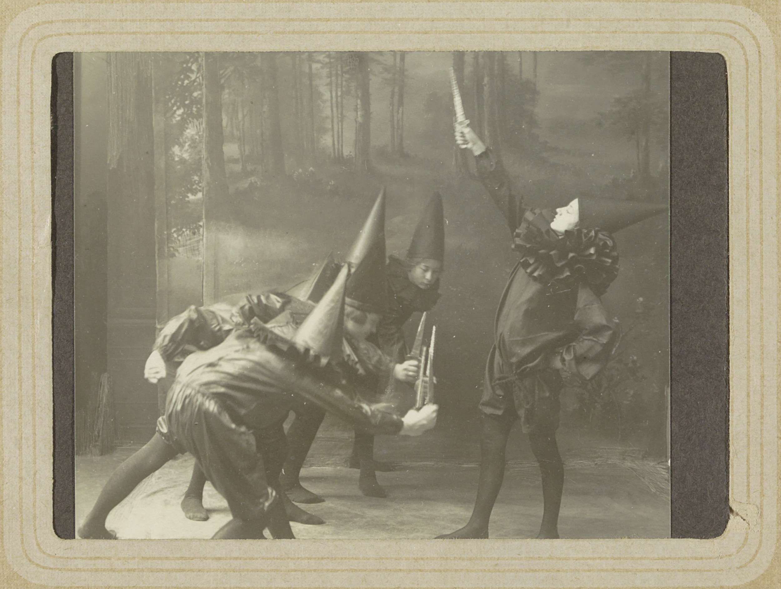 Zes verklede figuren met puntmutsen en dolken dansen...