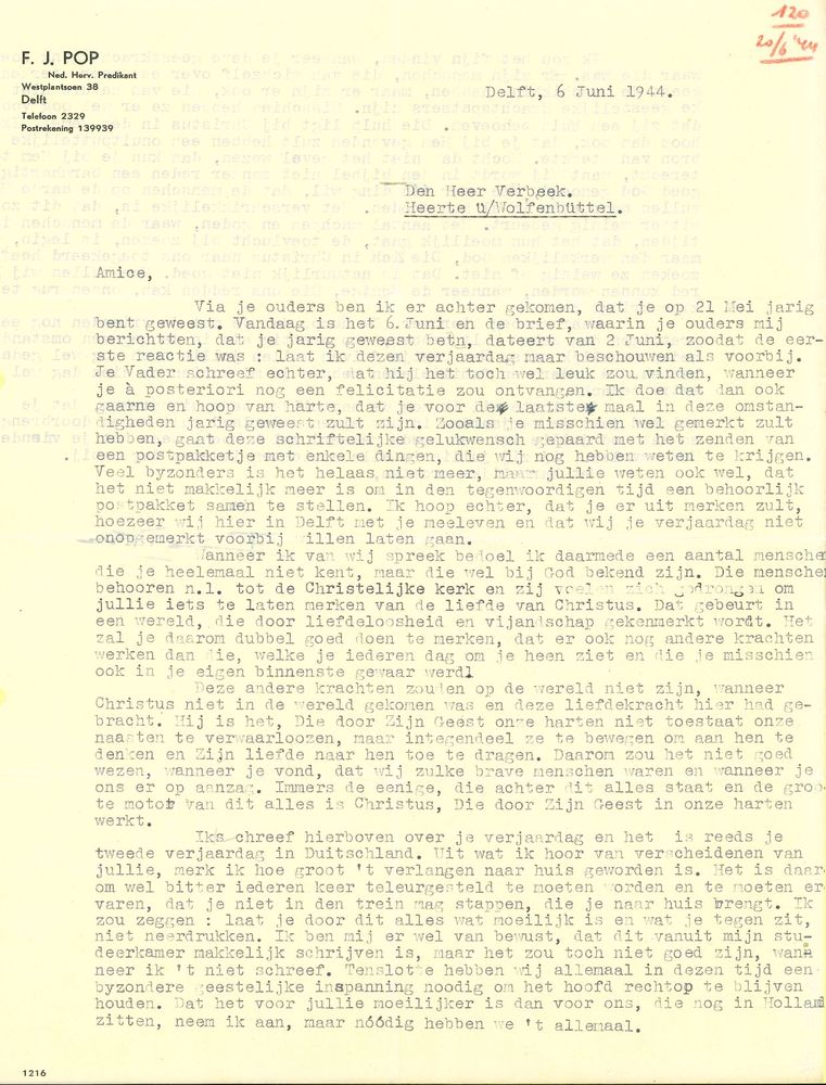 Brief van predikant F.J. Pop in Delft aan Gé Verbeek...