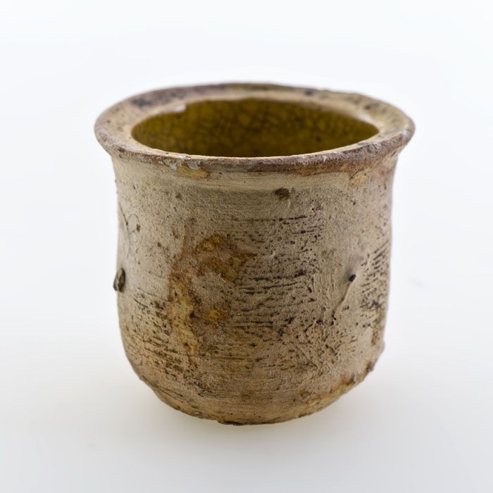 Aardewerk zalfpot, witte scherf, geheel geel geglazuurd