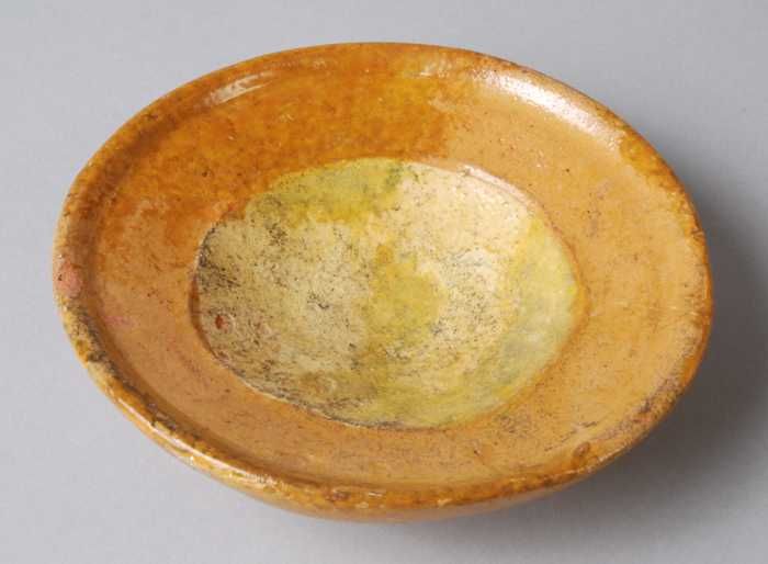 Kleine aardewerken schotel of zoutschaal, geel en br...