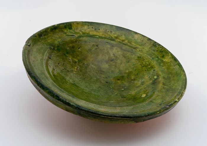 Aardewerk schotel, witte scherf, groen geglazuurd, o...