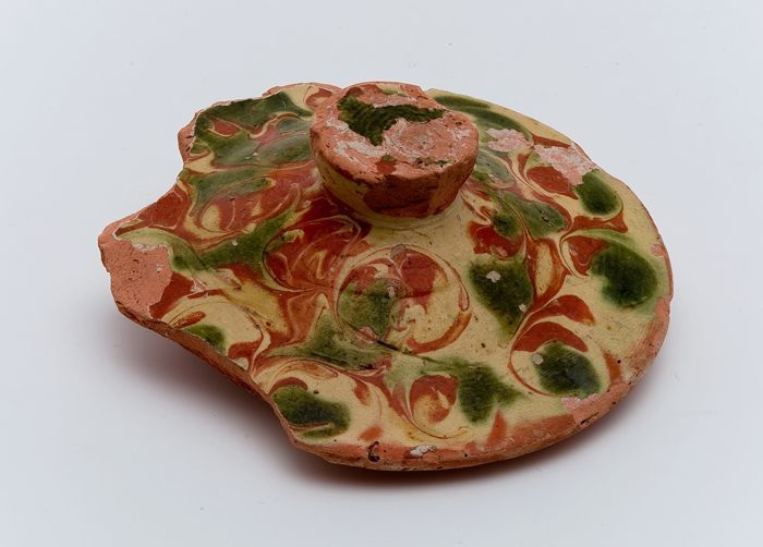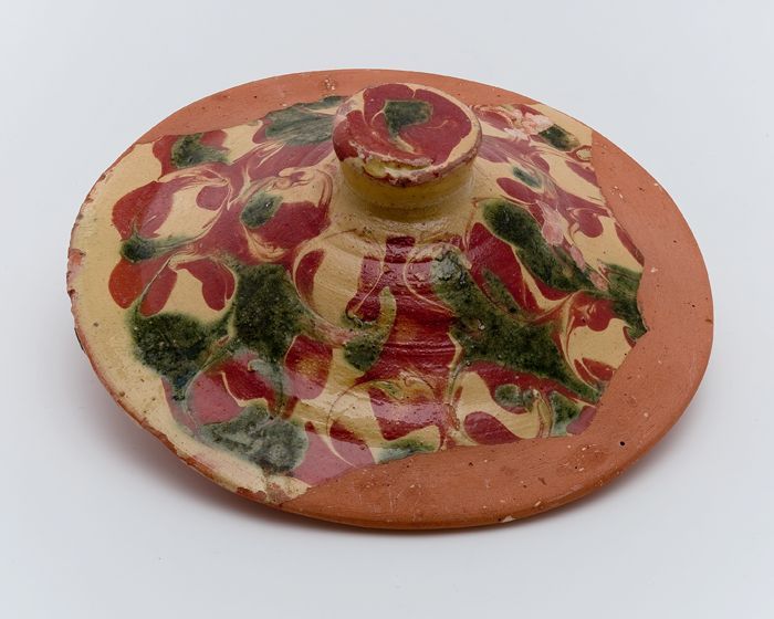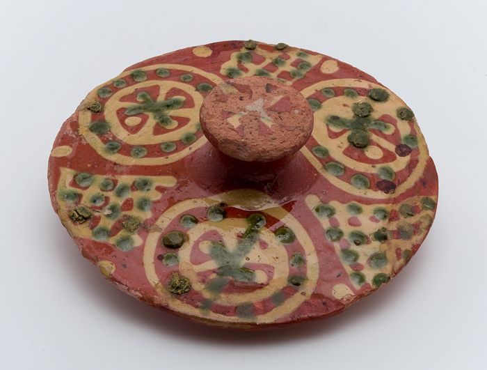 Aardewerk deksel, rode scherf, versierd in slibtechniek