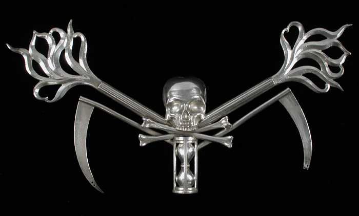 Doodshoofd met beenderen, zandloper, fakkels en zeisen