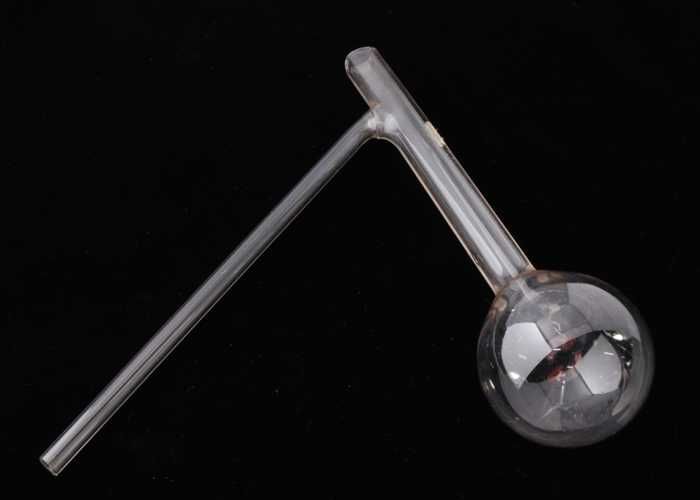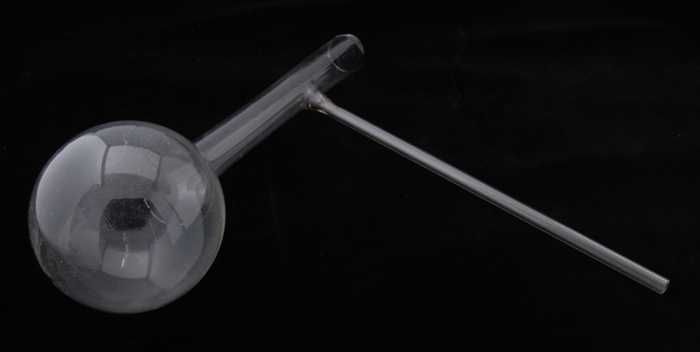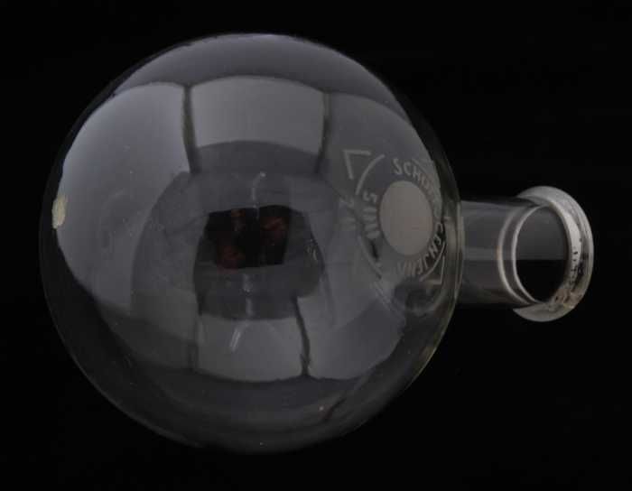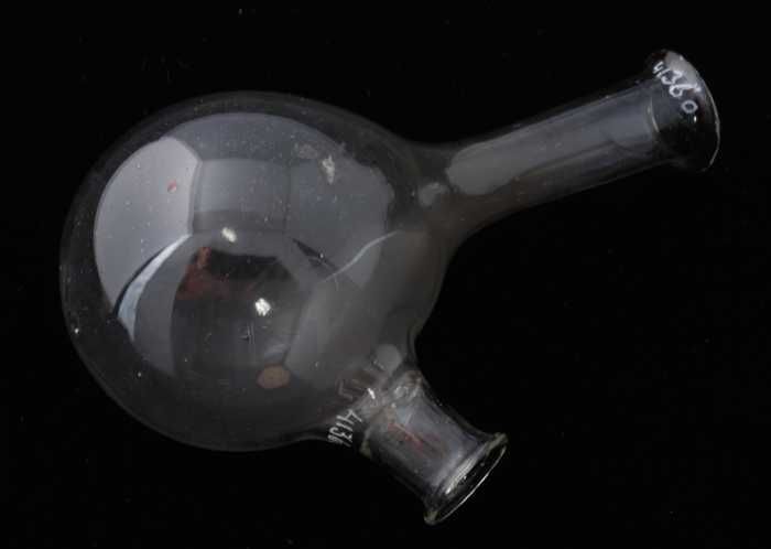 Glazen kolf met ronde bodem en naar beneden aflopend...