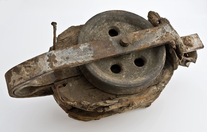 Houten hijsblok, met twee ijzeren katrollen