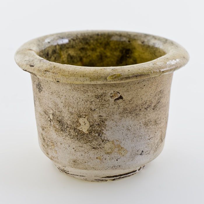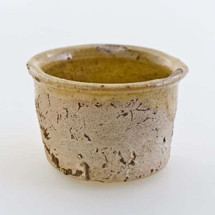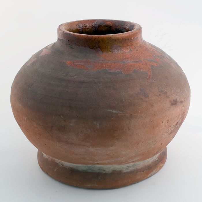 Aardewerk pot op wijde standring, rond en gedrongen ...