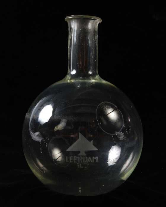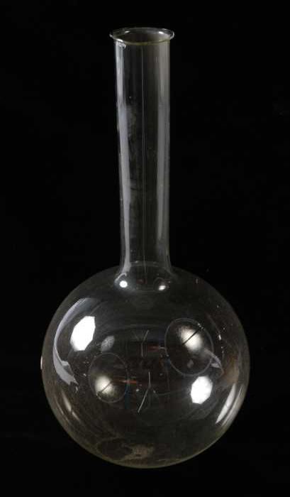 Grote glazen kolf met ronde bodem, gebruikt in apotheek