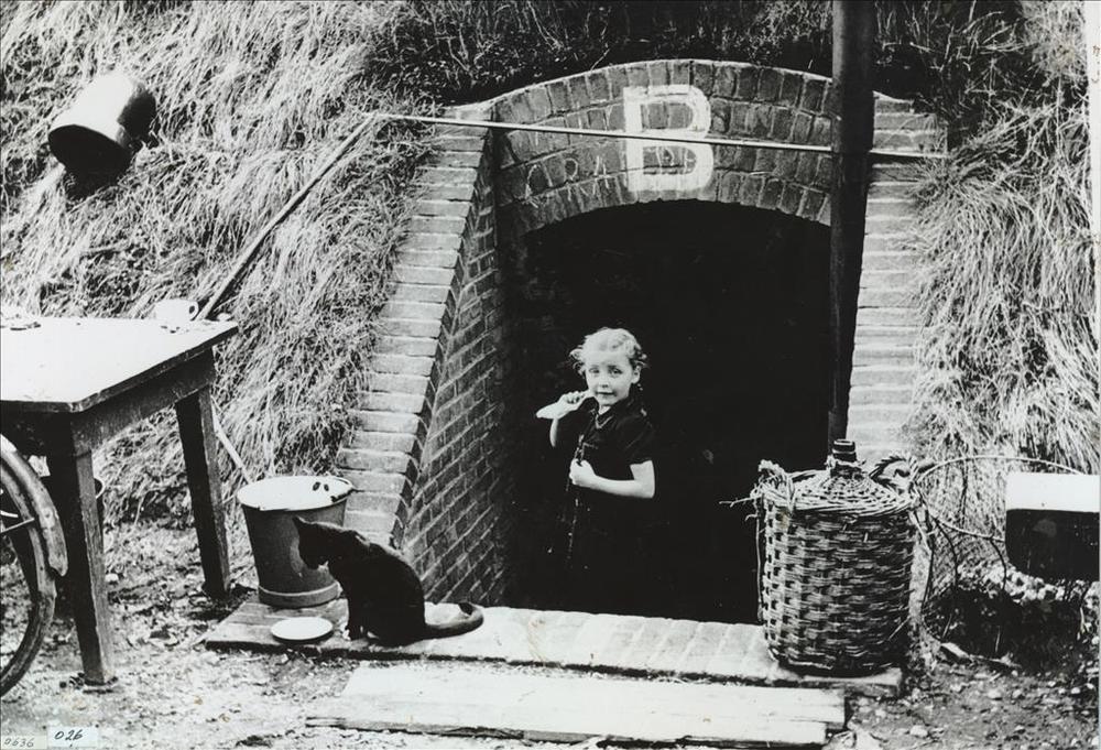 Dia van een meisje voor de ingang van de schuilkelde...