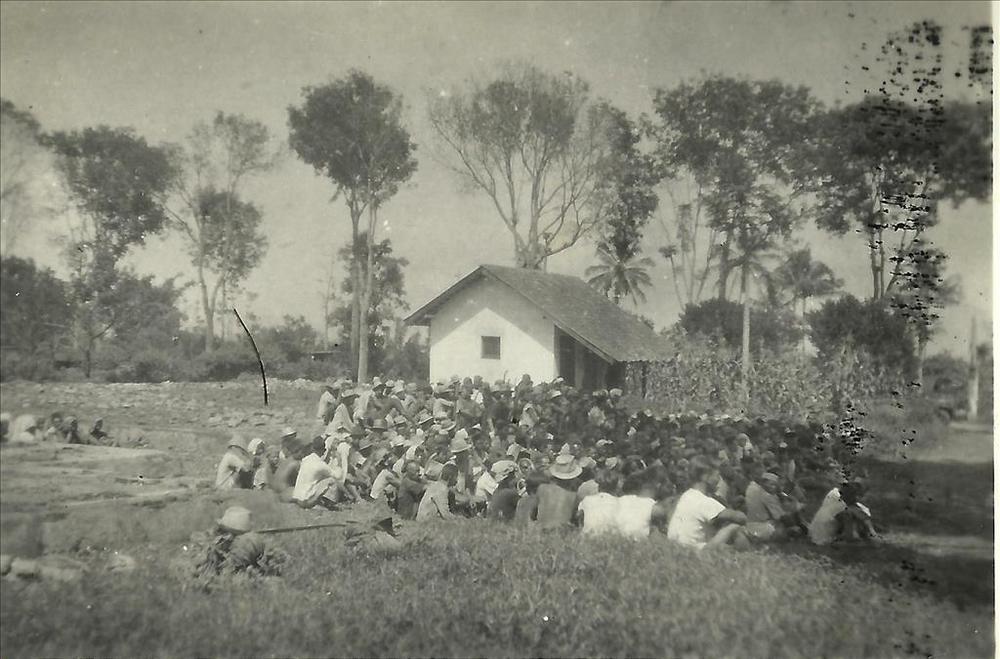 Nederlands Indië; huis, vlakte, openlucht bijeenkomst
