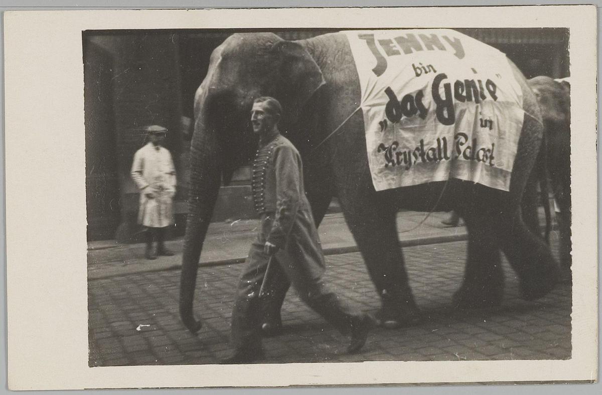 Olifant loopt door de stad met reclame: Jenny. Bin d...