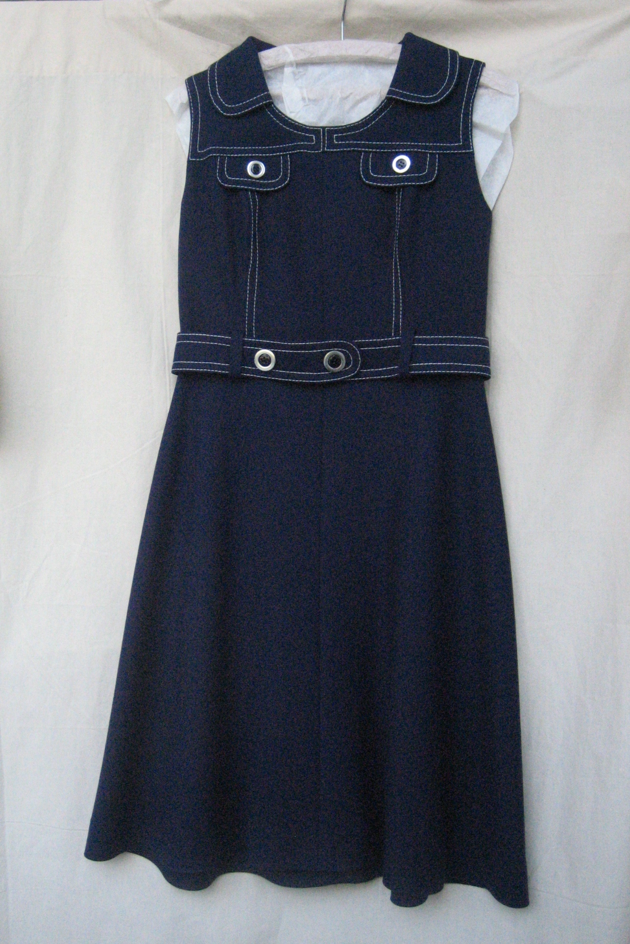 Jurk van donkerblauwe wol met witte stiksels, mouwlo...