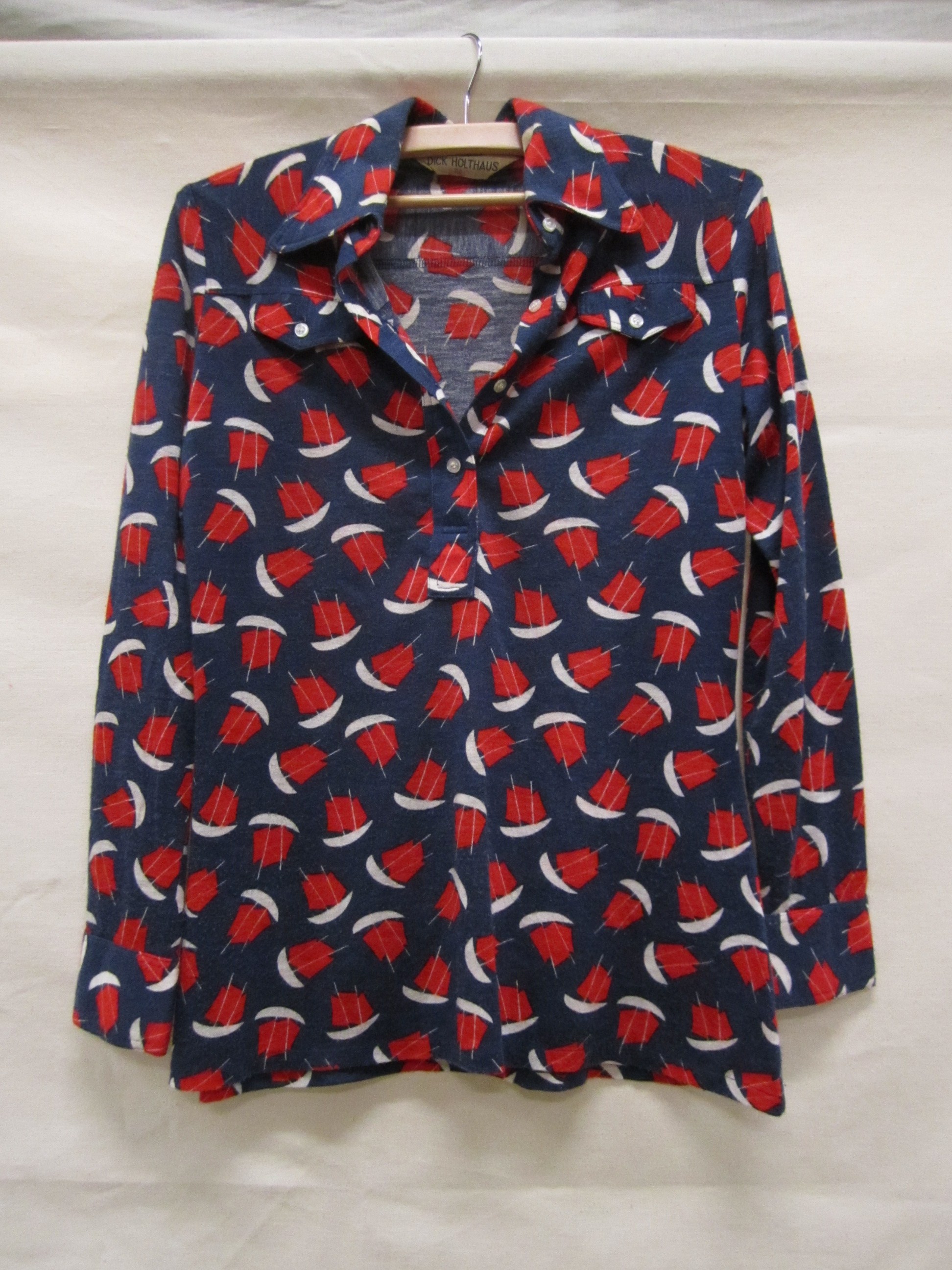 Poloblouse van tricot, blauw fond bedrukt met rode e...