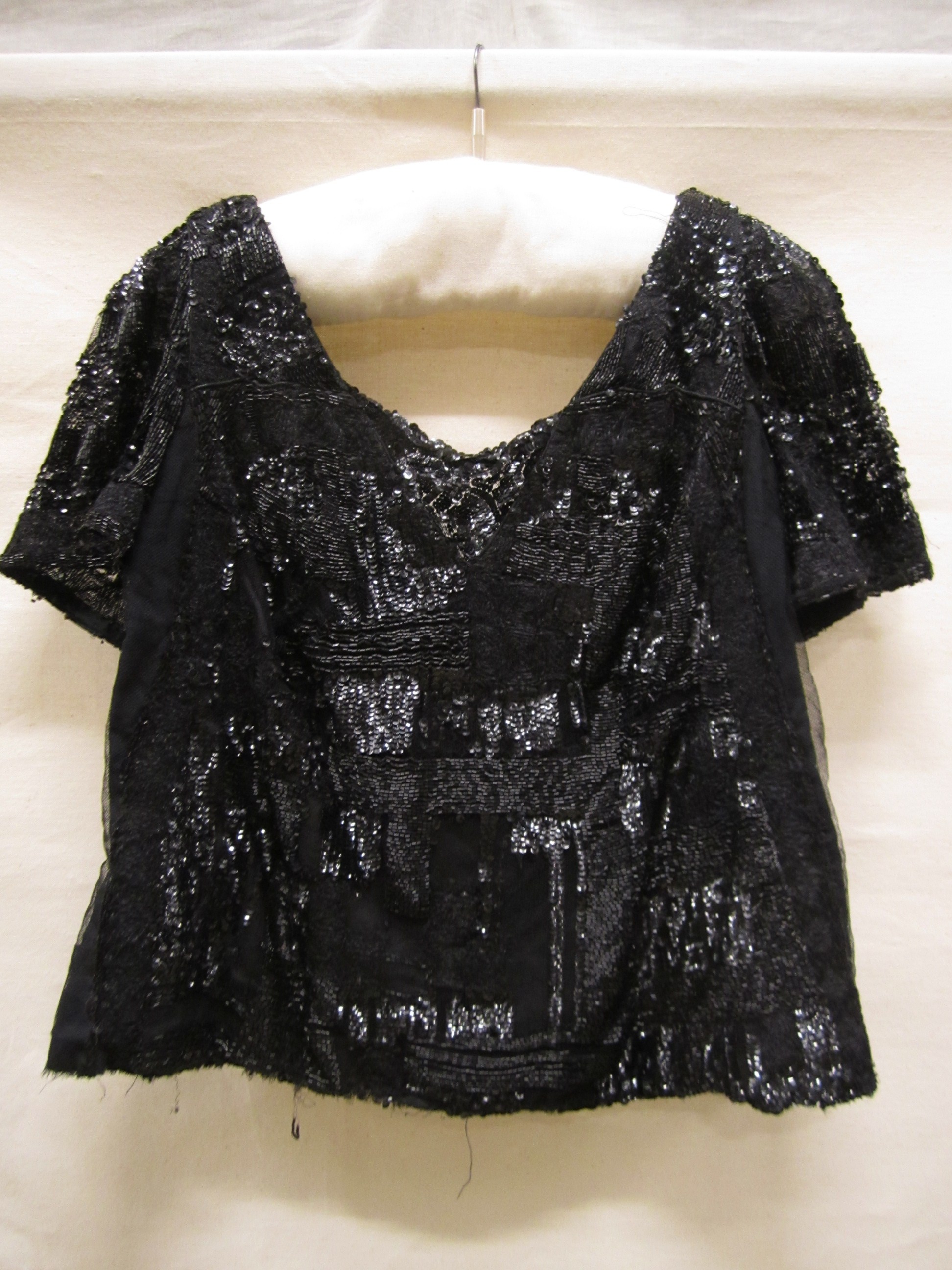 Lijfje of top van zwarte zijde en tule, bezet met zw...