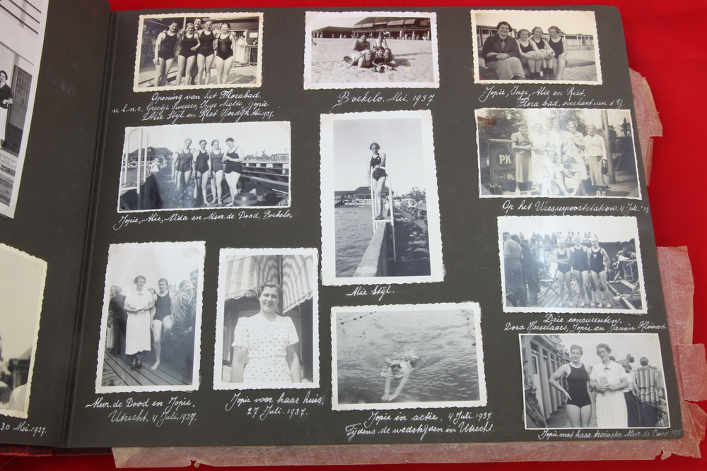 Rood fotoboek met foto's van de zwemster Jopie Waalb...