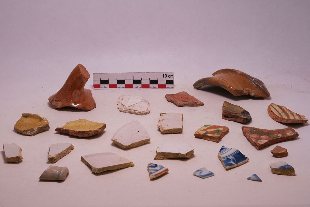 Fragmenten, been/aardewerk/ijzer/glas/schelp/kalk,