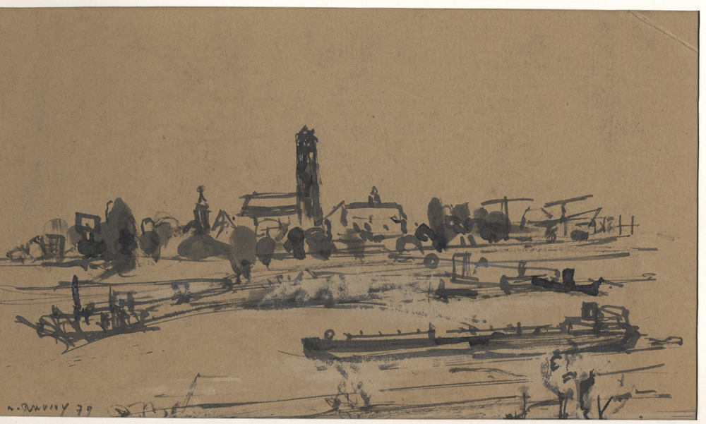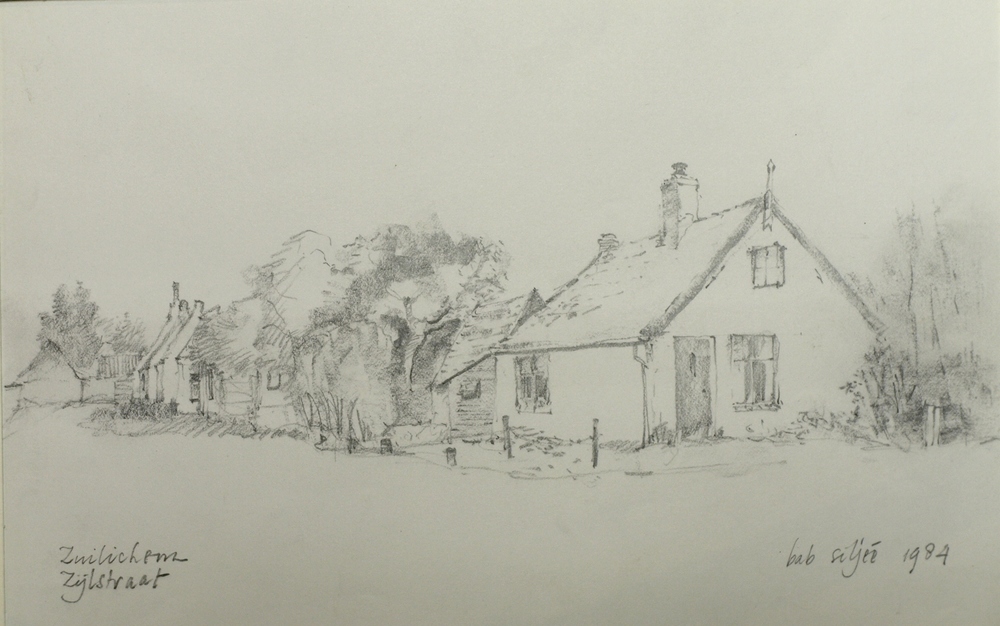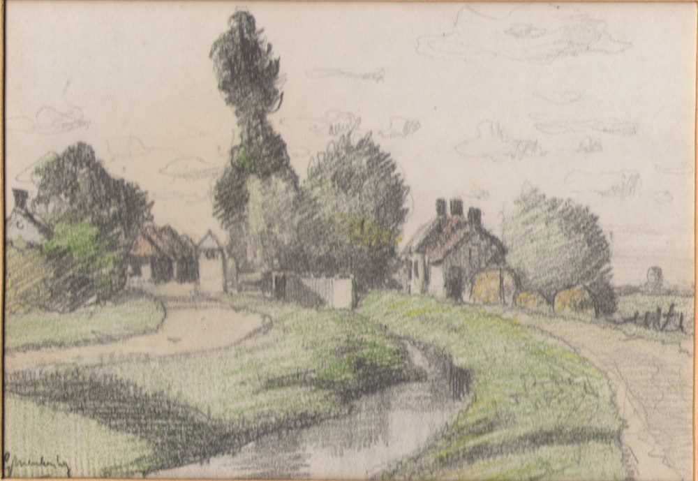 potlood -krijt tekening op papier "Huisjes te Bruche...