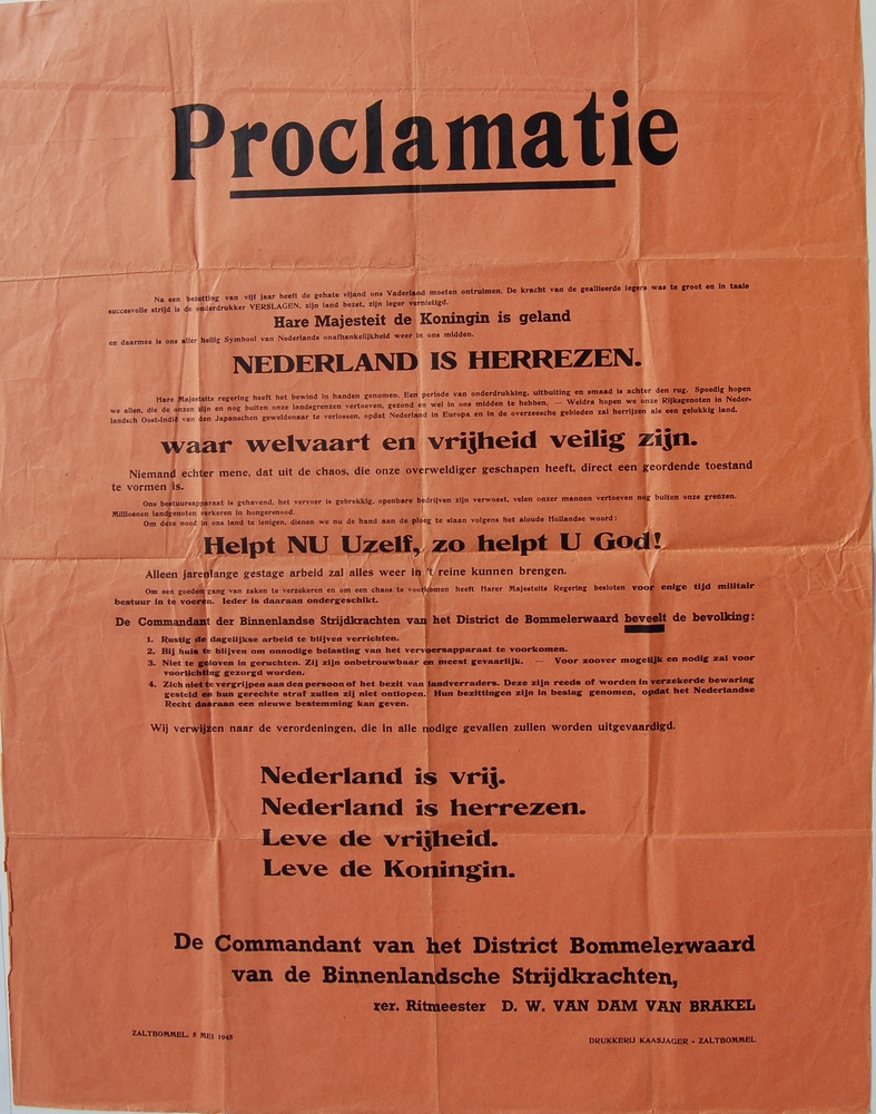 affiche-aankondiging, proclamatie bevrijding van Ned...