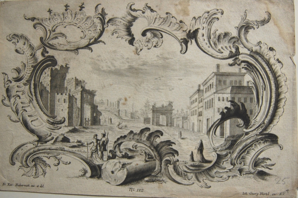 Gezicht in een stad met ruïnes en huizen. Kopergravu...