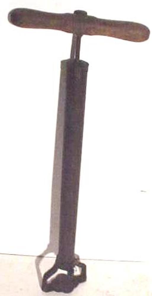 fietspomp. IJzeren cylinder met houten voetstuk, han...