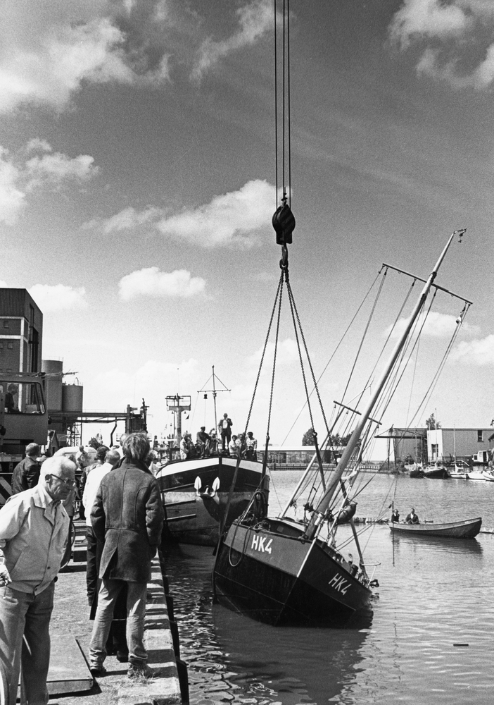 Hijskraan bergt gezonken kotter HK 4 uit Lelyhaven