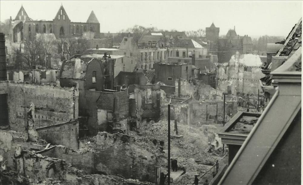 Ruïne Houtstraat richting Broerstraat na de bevrijdi...