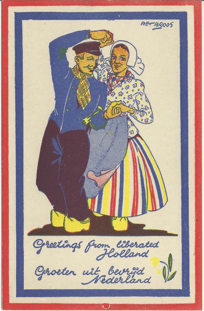 Groeten uit bevrijd Nederland man en vrouw in kleder...