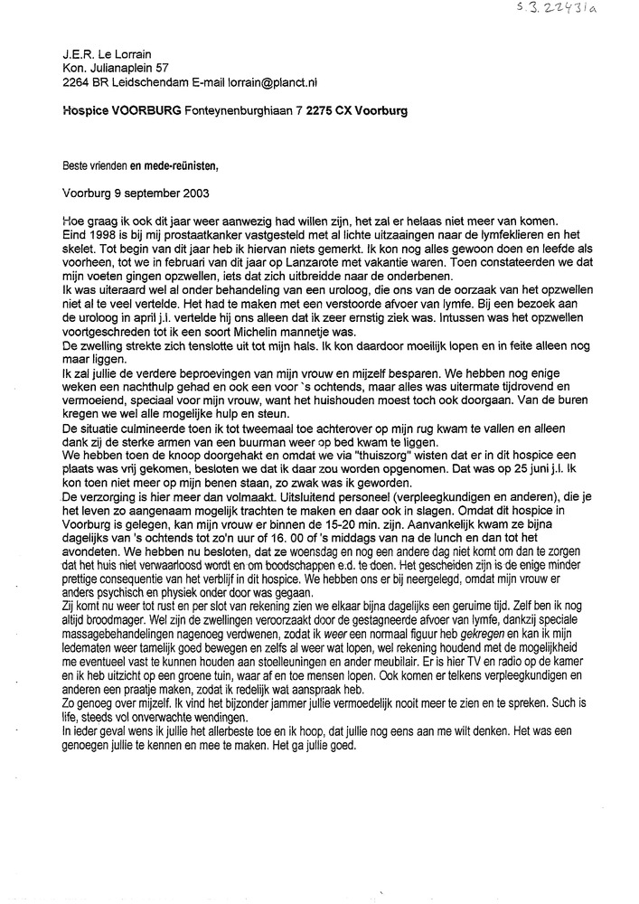 brief J.E.R. Le Lorrain aan Reünisten Pematang Siantar
