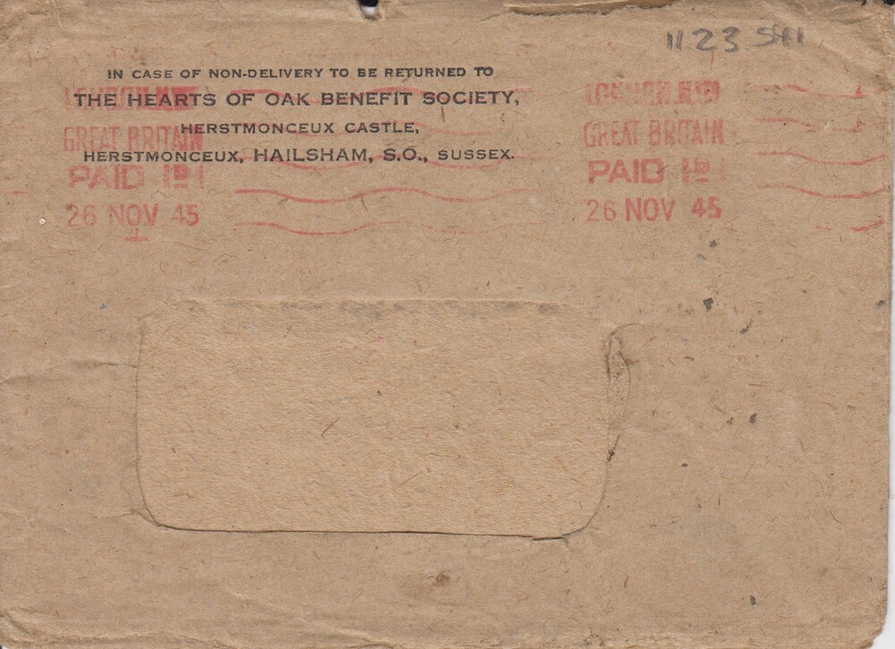Envelop Hearts of Oak Benefit Society, 1945