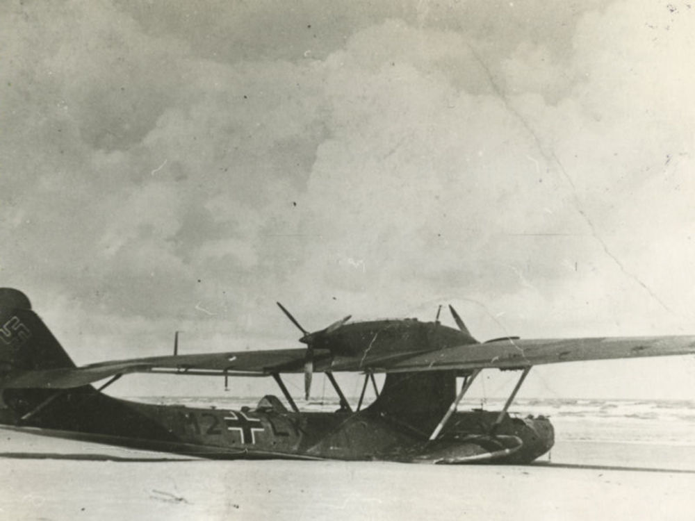 Foto van Dornier Do- 18 G-1 die op het strand ligt. ...