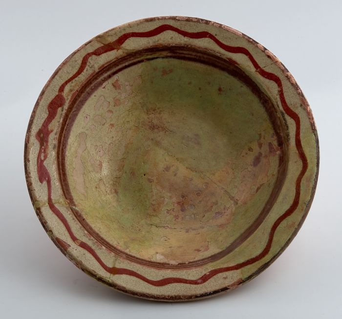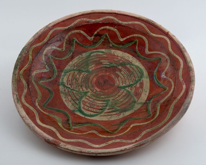 Aardewerk schotel, ringeloorbord, inwendig geglazuur...