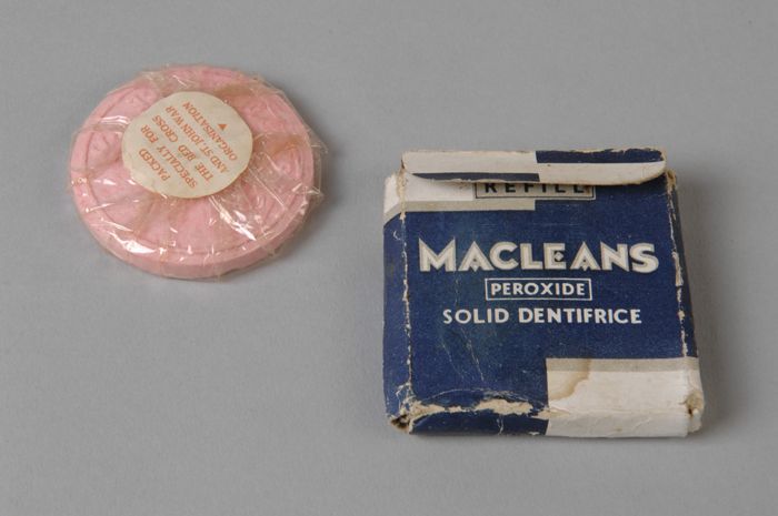 Rond rozekleurig blokje tandpasta in cellofaan met d...