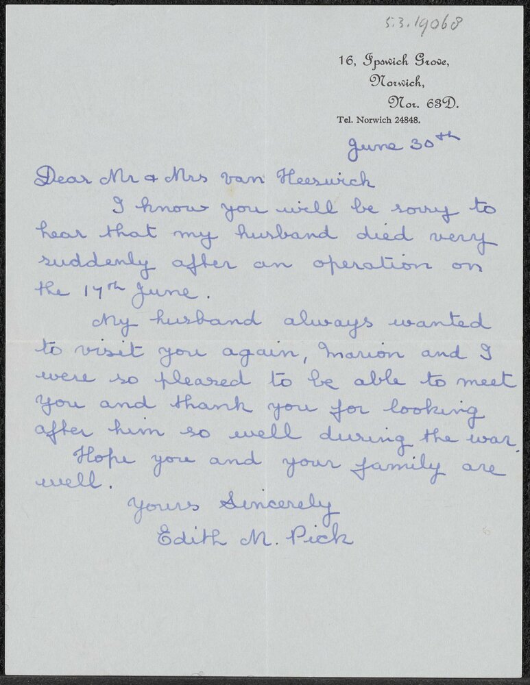 Briefje van Edith M. Pick aan Mr. & Mrs. van Heeswij...