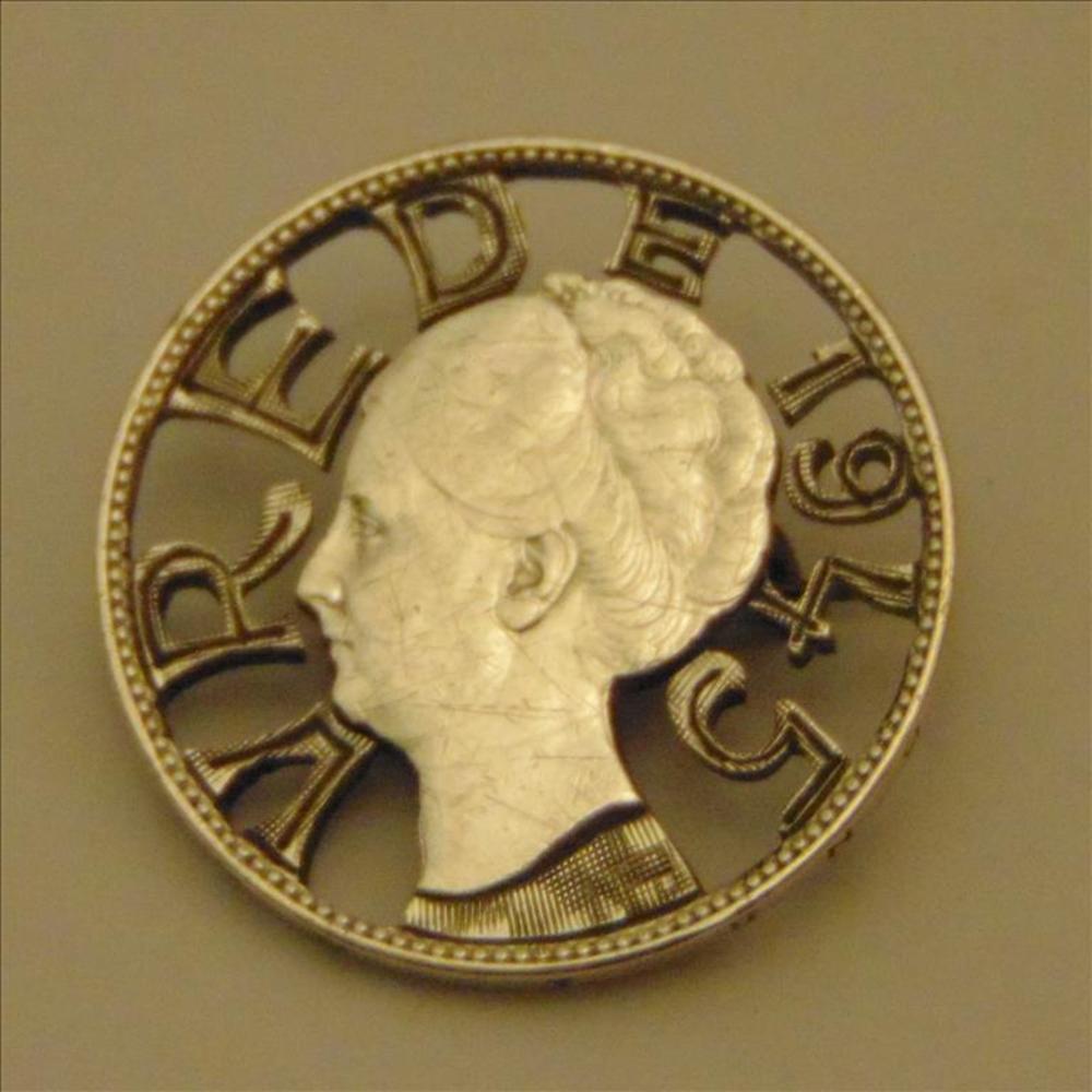 zilveren broche gemaakt van een munt met de afbeeldi...