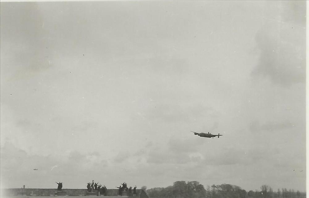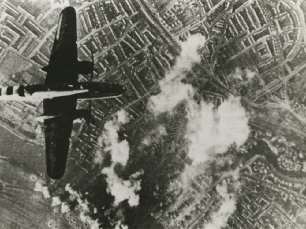 Foto van Mitchell bommenwerper boven stad. Tekst ach...