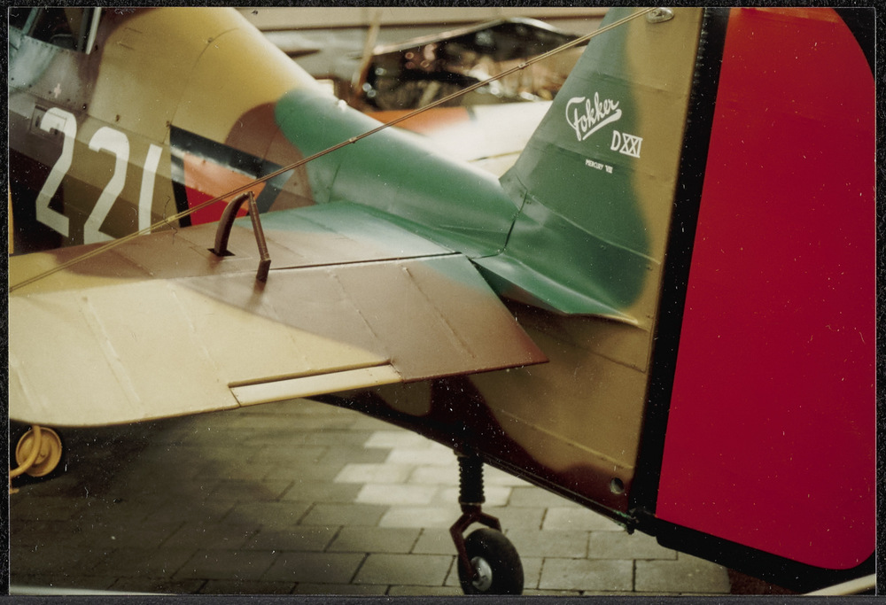 Foto van de staart van een Fokker D XXI vliegtuig.