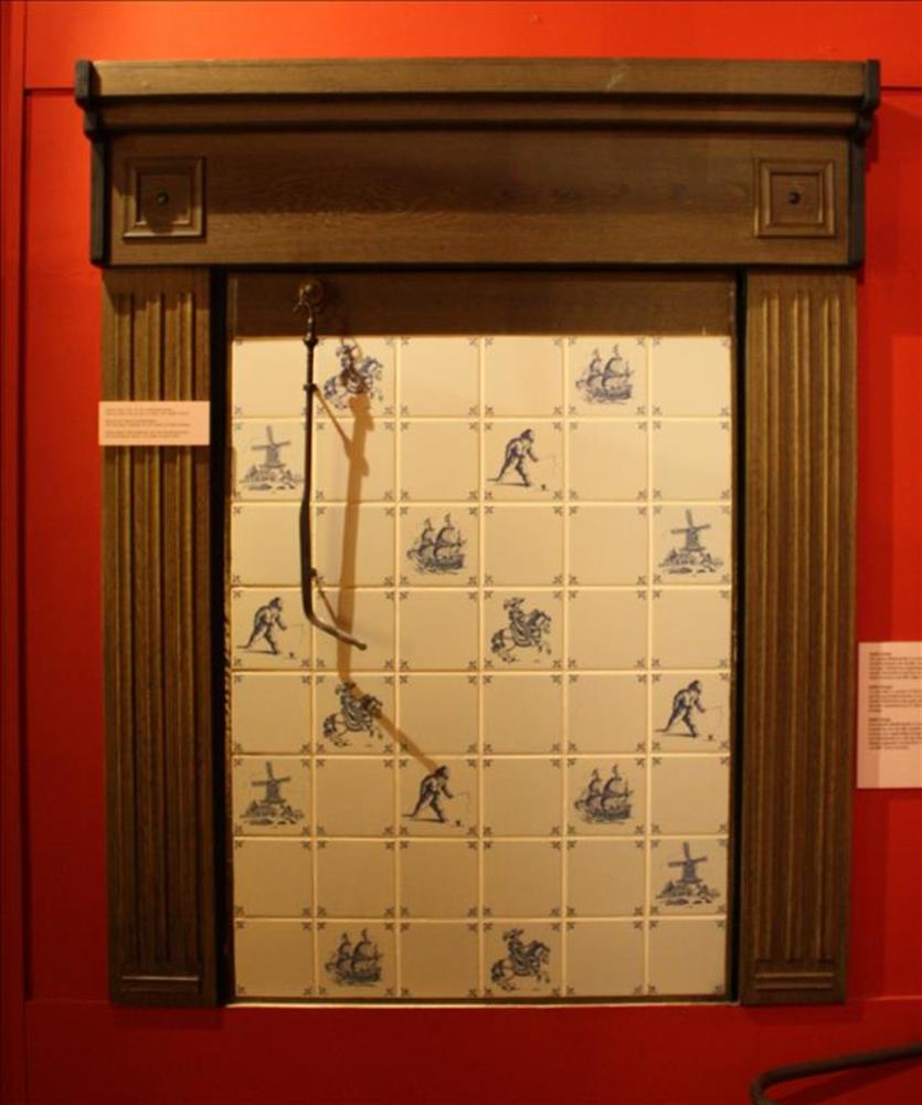 Houten Schouw met draaibaar tegeltableau en een pook...