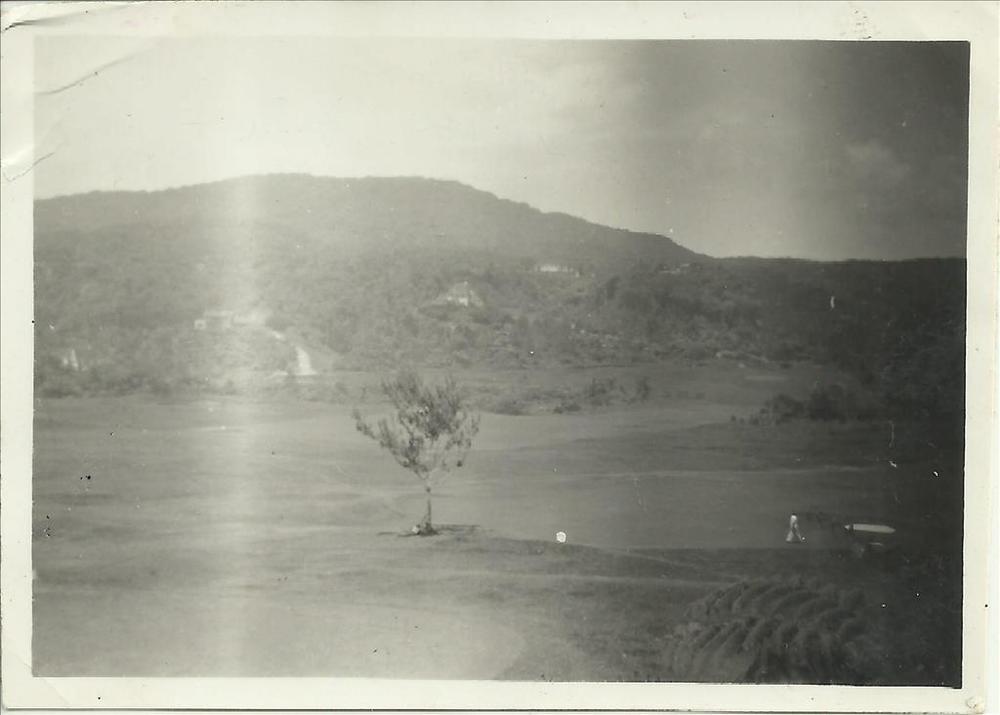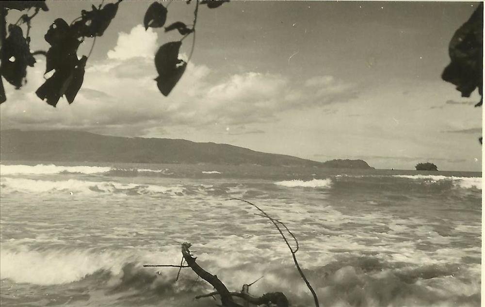 Nieuw-Guinea; branding in baai gezien vanaf land