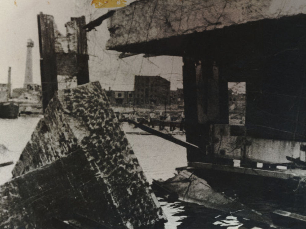 Foto van vernielde Duitse Schnellboot bunker. Tekst ...