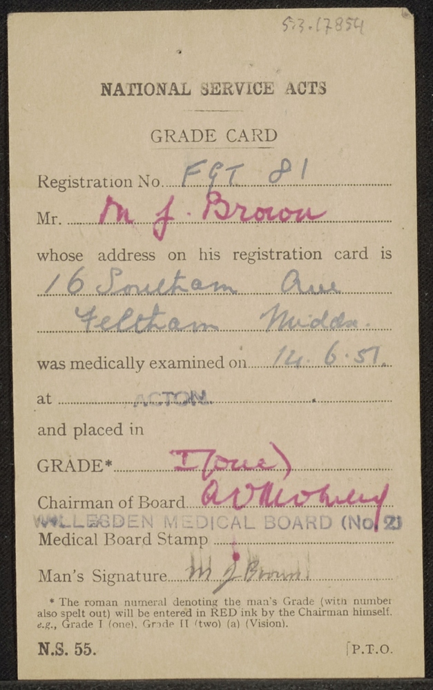 National Service Act - Grade Card op naam van M.J. B...