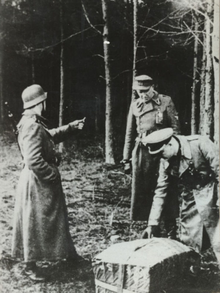 Duitse militairen (SS) bij gedropte manden met wapen...