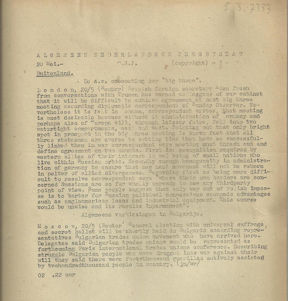 Algemeen Nederlandsch Persbureau, mededelingen, 20 m...