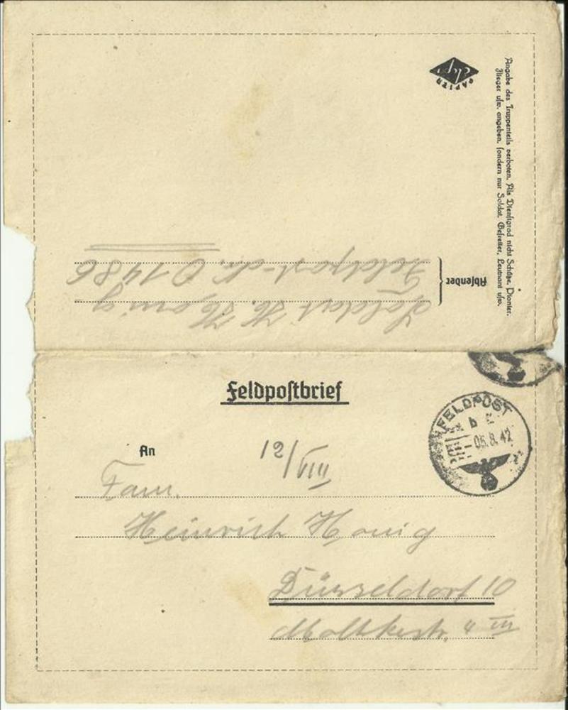 Briefkaart van Heinrich (soldaat) Honig aan Frau Hon...