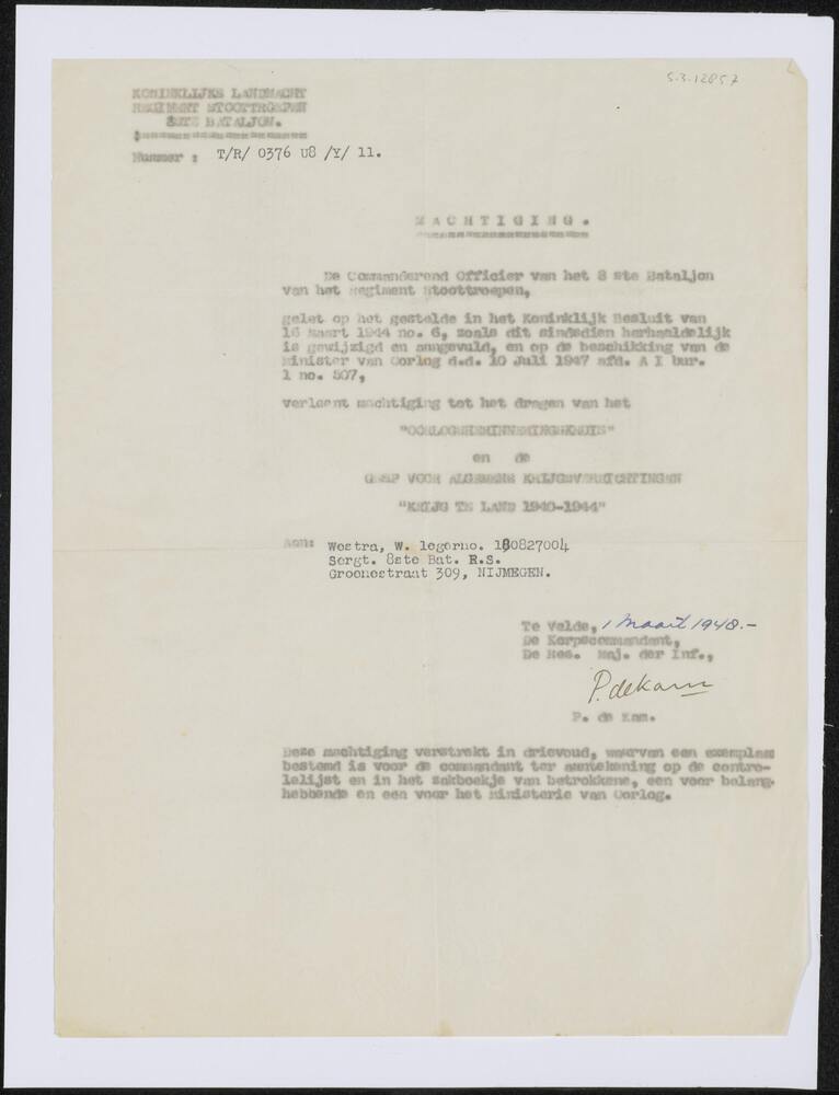 Machtiging van commandant 8ste bataljon Stoottroepen...