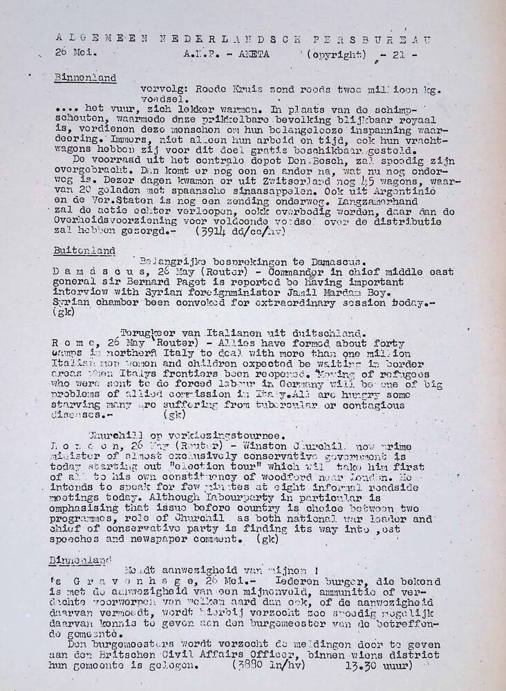 Algemeen Nederlandsch Persbureau, mededelingen, 26 m...